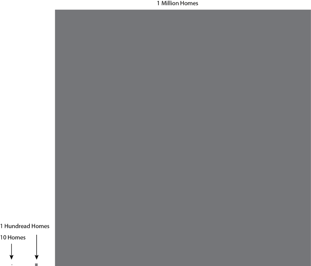 It was not until recently, when I was explaining the tedious and assumption-filled process of converting from MW to homes that I realized I did not even really know what 1 million homes looked like. It occurred to me that probably very few people are actually able to grasp 1 million homes. The order of magnitude is just too big. We know what one home is, we probably can imagine 10 or maybe even 100 homes in our immediate area, but 1 millinon?